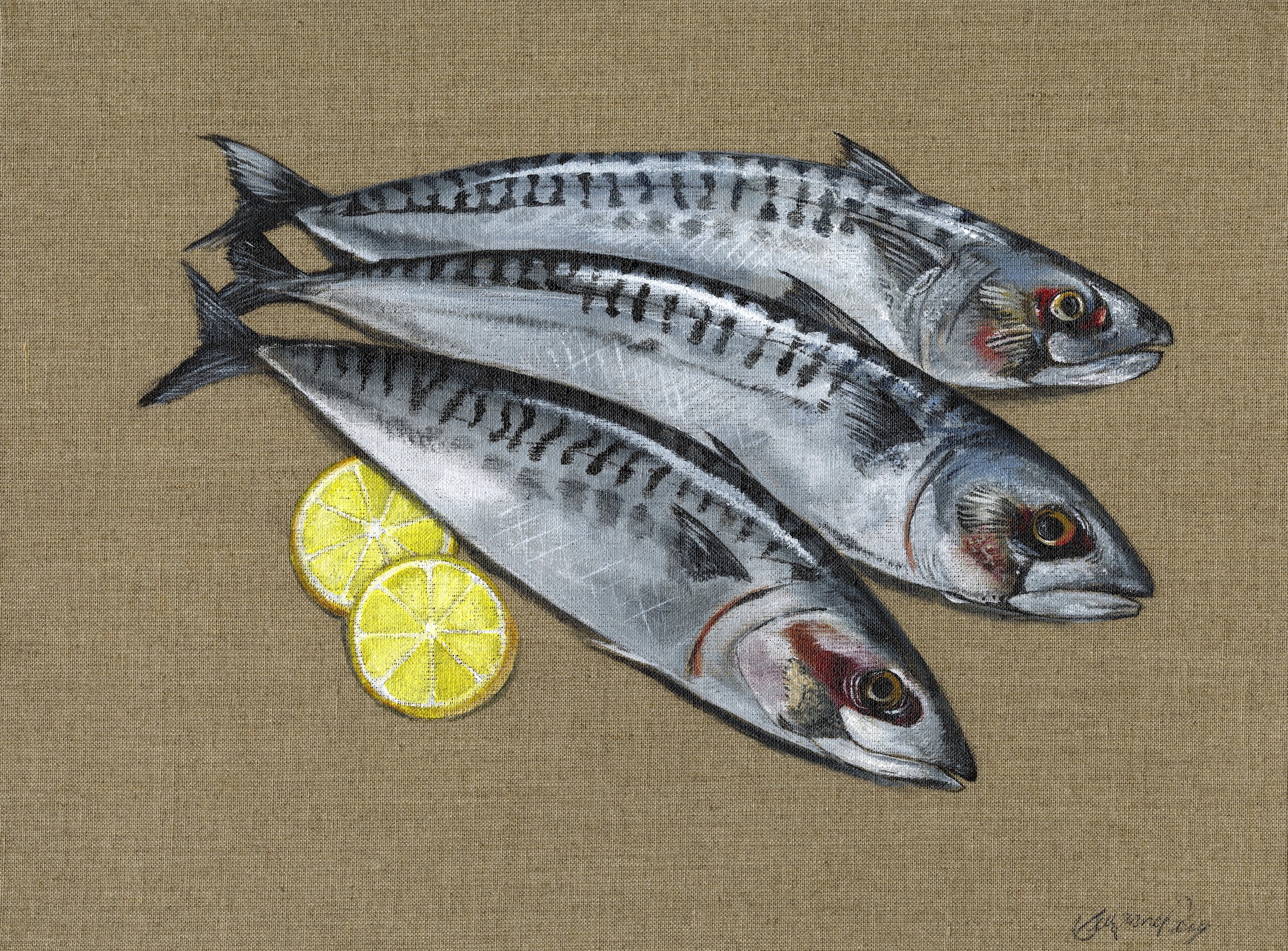 This fish design is on Loxley clear primed linen canvas board. The linen fabric is laminated on to rigid, high quality medium density fibre board, which suits my style perfectly. The texture is obviously very different from the Crescent Board that I have been using for a long time and I am pleased how easily it has been to adapt. The look of the linen seems to complement my style of painting.