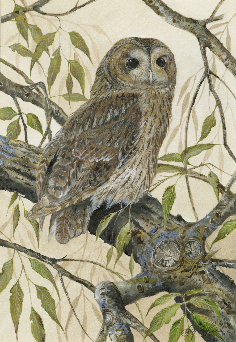 Framed Size 16"x 12", with non reflective glass. Willow, aptly named as he sits in a willow tree, was a commission for a dear friend who wanted a companion for the original " Hector " Tawny Owl. They now sit facing each other across her dining room table. A most handsome pair!