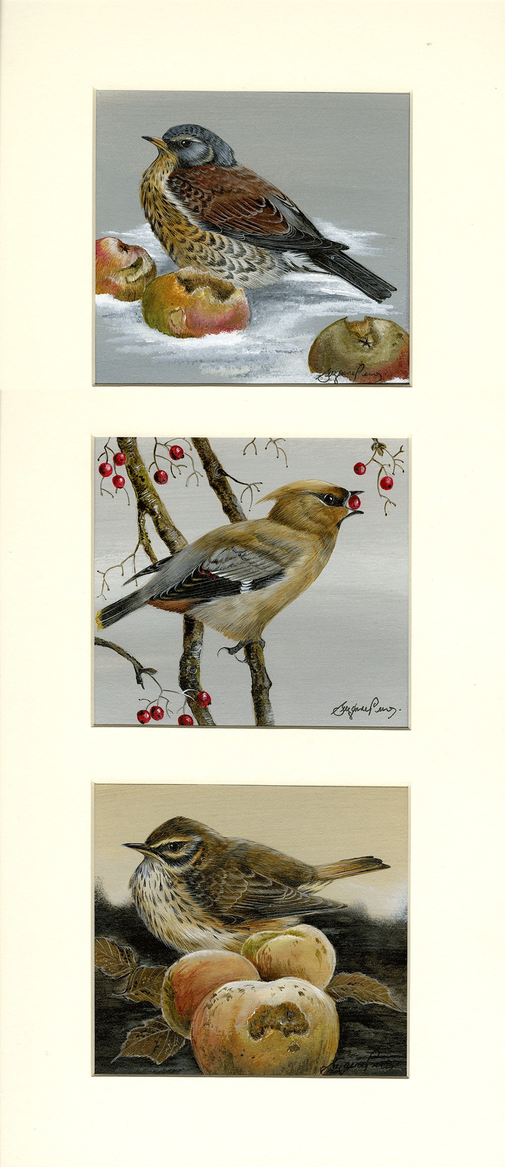 Framed size 23" x 9", with non reflective glass. A visiting birds three, the Waxwing, Fieldfare and Redwing. SOLD at the Hadleigh Show.