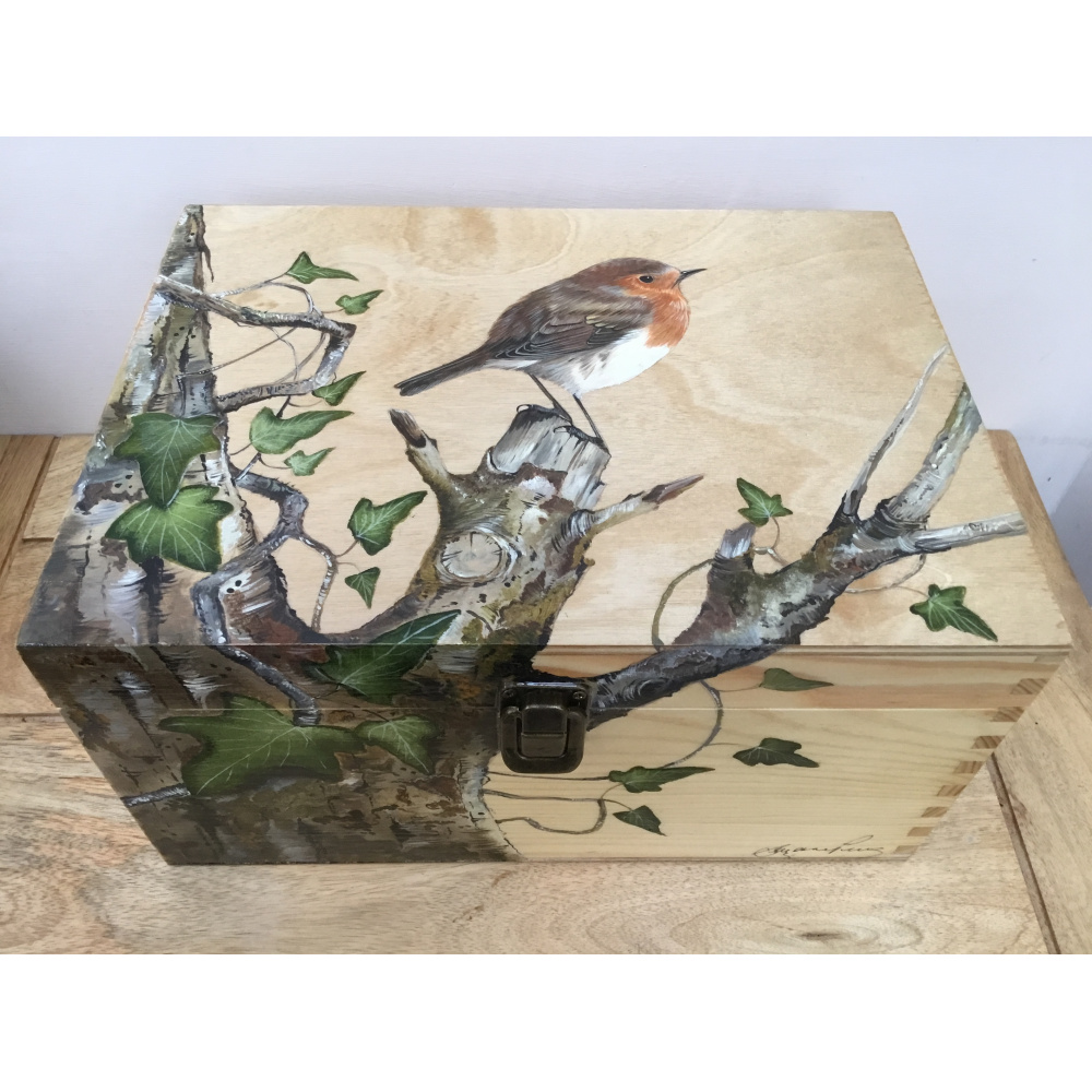 A wooden hand painted Keepsake Box ( L=270mm W=140mm D=200mm) with Robin with Ivy design on top and front. Ideal for home, work or hobby purposes combining usefulness with a beautiful piece of art.